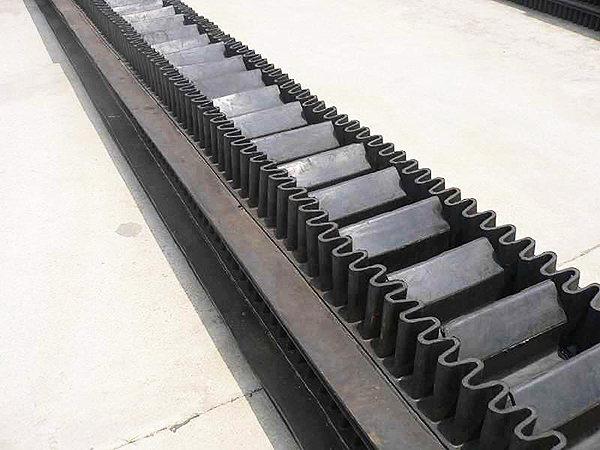 大傾角波狀擋邊帶由基帶、擋邊、橫隔板3部分組成,擋邊起防止物料測滑撒落的作用。為便于繞過滾筒,檔邊設計成波紋狀;橫隔板的作用是承托物料,為了實現大傾角輸送,采用T型TC型。檔邊和橫隔板是用二次硫化的方法與基帶連接的,具有很高的連接強度。